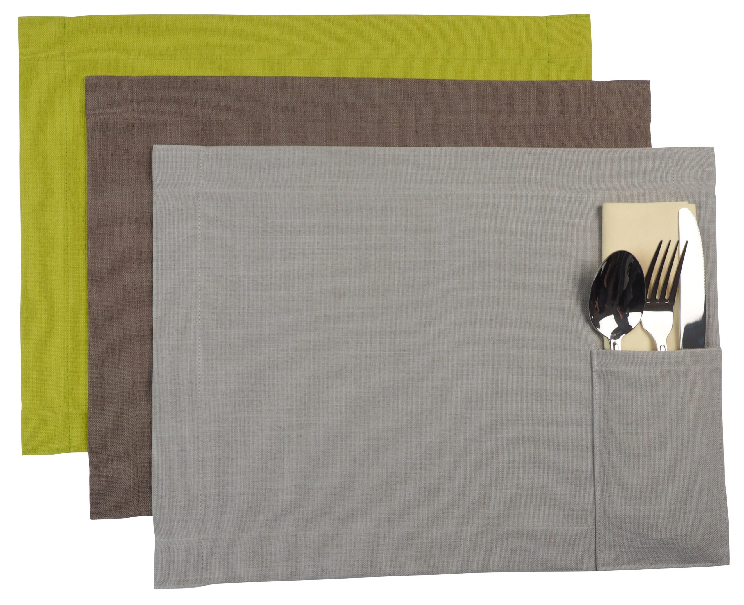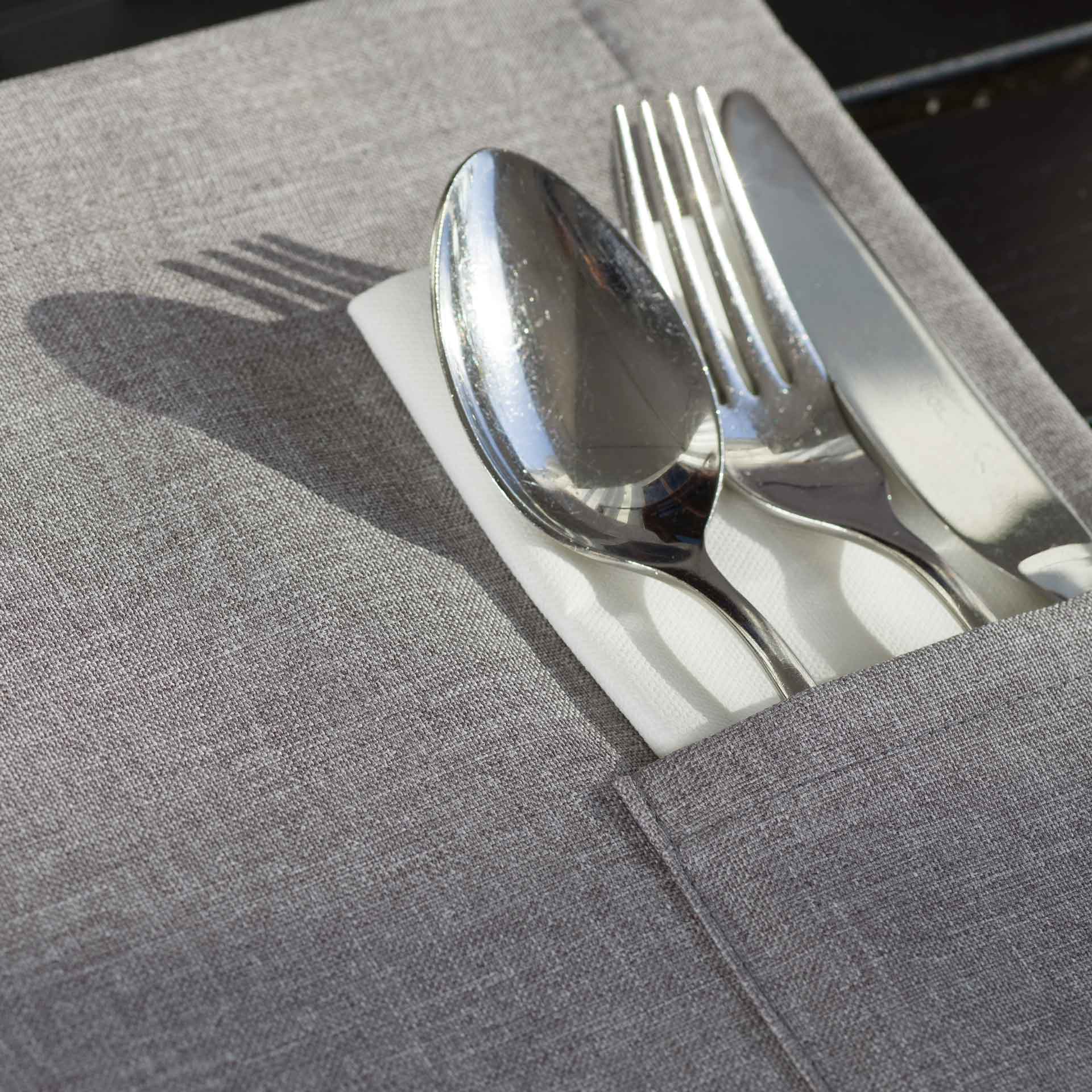 1 Fach. 3 cm Normaler Saum mit integrierter Servietten-/Bestecktasche 9,5 x 15 cm.